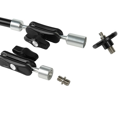 Монтажная система включает две втулки. Одна оснащена съемным адаптером 3/8”, другая — двусторонним адаптером 1/4”-3/8” с круглой площадкой диаметром 40 мм для плотной фиксации оборудования.