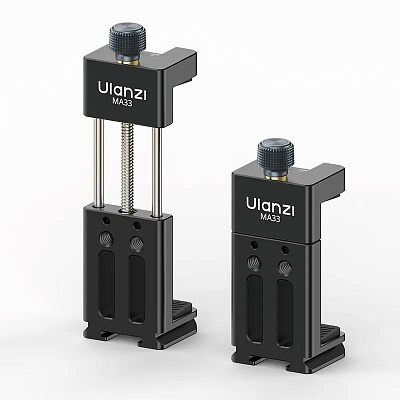 Прочный и надежный держатель для телефона Ulanzi MA33 подходит для смартфонов шириной от 60 до 95 мм. С обеих сторон зажима располагаются холодные башмаки для аксессуаров, которые позволяют легко собрать компактную конфигурацию для видеоблогинга, веб-трансляций и многого другого, а внизу и с тыльной стороны – резьбовые гнезда 1/4" с отверстиями под боковые шпильки.