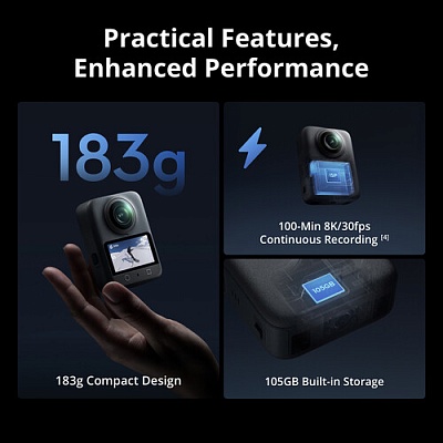 Высокопроизводительный чип обработки изображений в сочетании с усовершенствованной системой охлаждения обеспечивает непрерывную запись в формате 8K/30 кадров в секунду продолжительностью до 100 минут и до 190 минут записи при съемке видео 6K 360°.