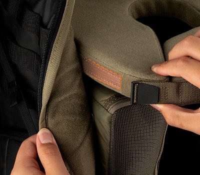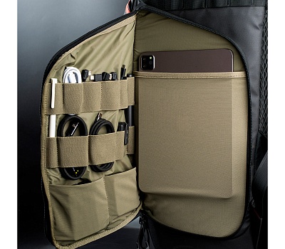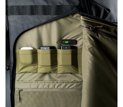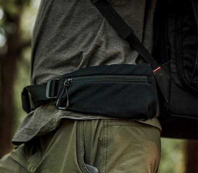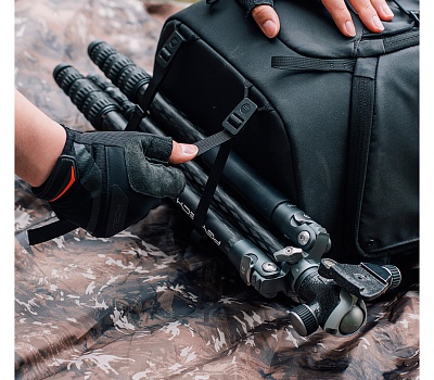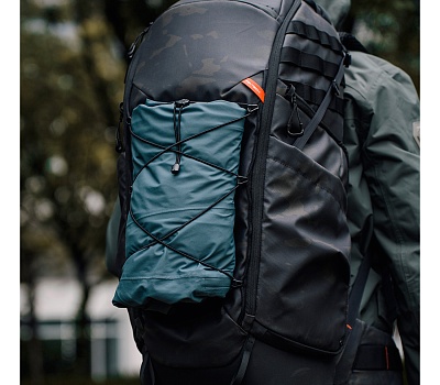 С обеих сторон снаружи располагаются широкие боковые карманы на молнии для аксессуаров и личных вещей, а также открытые карманы для бутылки воды, термоса или штатива. В закрытых карманах имеются органайзеры для различных мелочей (кабели, USB аккумуляторы, зарядные устройства и так далее). Спереди сверху есть еще 1 карман на молнии. Кроме того, прошивка лентой MOLLE по бокам, эластичная шнуровка спереди и петли в нижней части позволяют закрепить снаружи различные крупногабаритные вещи: например, свернутую куртку, туристический коврик или палатку, подсумок для котелка и так далее. На плечевой лямке есть карман для телефона / рации / небольшой фляжки, также предусмотрены карманы на молнии на поясном ремне (поясной ремень съемный). На левой лямке имеются точки крепления для металлической пряжки PGYTECH Beetle, которая позволяет дать рукам отдых между съемками (пряжка продается отдельно). Есть потайной кармашек для Apple AirTag или схожего по размерам GPS-трекера.