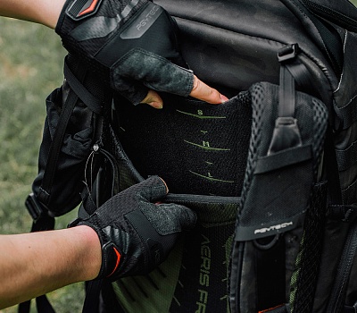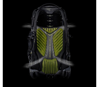 Одним из главных преимуществ рюкзаков OnePro является жесткий алюминиевый каркас спинки, так называемая 3D рама. Она придает спинке жесткость, благодаря чему большая часть нагрузки переносится с плеч и спины область поясницы. Спинка снабжена широкими вентиляционными карманами и ребристым уплотнителем. Очень широкие лямки и широкий пояс, дополнительно смягченные подкладкой из дышащего вспененного материала, отлично распределяют нагрузку, поэтому рюкзак не вызывает дискомфорта даже при полной загрузке. Спинка регулируется по высоте (относительно лямок).