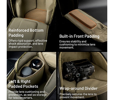 Вместимость: зеркальная или беззеркальная камера (в т.ч. с батарейной ручкой) с установленным телеобъективом до 1200mm f/8 + до 4 объективов обычного размера (16-35/2.8, 24-70/2.8 и т.п.), планшет 10"
