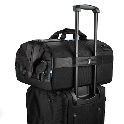 Съемный плечевой ремень с гибкой наплечной накладкой с силиконовыми стопами надежно фиксируется на плече и не соскальзывает. Сумку удобно носить даже при полной загрузке. Комфортная накладка из натуральной кожи обеспечивает удобный хват. Предусмотрены боковые ручки для переноски вдвоем. Предусмотрена установка на тележку или чемодан на колесах в горизонтальном и вертикальном положении. Два ремня надежно фиксируют сумку даже в вертикальном положении.