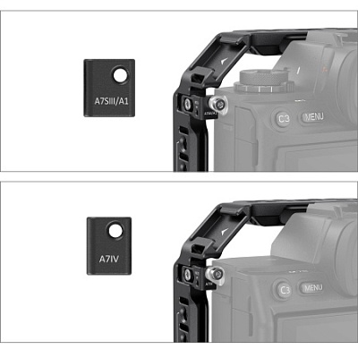 SmallRig 3667: прочная клетка из цельного куска алюминия для камер Sony A7 IV, A7S III и А1. Множество резьбовых гнезд 1/4"-20, 3/8"-16 и Arri 3/8”, холодный башмак и планка НАТО (слева) позволяют установить всё разнообразие дополнительных аксессуаров, в том числе: верхние и боковые ручки, мониторы, рекордеры, микрофоны, лампы постоянного света, фиксаторы для HDMI кабеля и так далее. Справа и слева предусмотрены проушины для крепления ремня. Клетка предоставляет свободный доступ к батарее, карте памяти, всем интерфейсам и большинству органов управления.