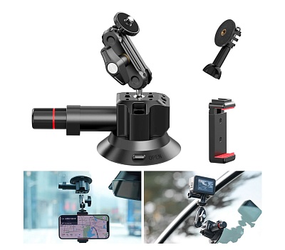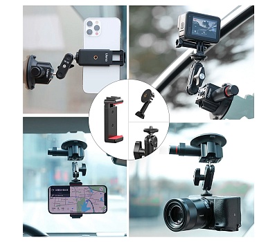 Крепление-присоска для телефона, экшен-камеры или фотоаппарата. Может устанавливаться на любые гладкие и чистые поверхности: стекло, полированный металл, кафель, глянцевый пластик и так далее. Крепление выдерживает нагрузку по вертикали до 12 кг, однако рекомендуется не превышать вес 1 кг. Интегрированный шаровый кронштейн позволяет свободно вращать и наклонять камеру для выбора оптимального положения. Кронштейн не снимается с корпуса присоски, что сделано для безопасности: это исключает самопроизвольное развинчивание во время использования. Штативный винт 1/4" позволяет устанавливать фотоаппараты, видеокамеры или аксессуары. В комплекте идет зажим для телефона и адаптер для экшен-камер.