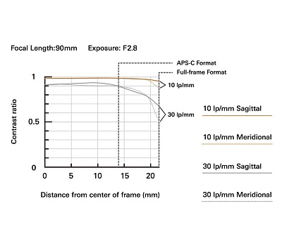 Объектив использует новую оптическую схему: 15 элементов в 12 группах, из них 4 специальных, с низким коэффициентом дисперсии. Эти элементы позволяют эффективно исправлять хроматические аберрации (ложные цвета, которые появляются на кромках контрастных объектов, а также в расфокусированных областях). Инженеры специально не стали применять асферические элементы, чтобы исключить эффект «луковых колец» на бликах от источников света. Как можно видеть из графиков MTF, это сказалось на резкости по краям кадра, но, во-первых, даже там резкость остается на хорошем уровне (никакой «каши»), а во-вторых, на графике показаны данные для f/2.8, а при диафрагмировании края, конечно, становятся такими же резкими, как и центр.