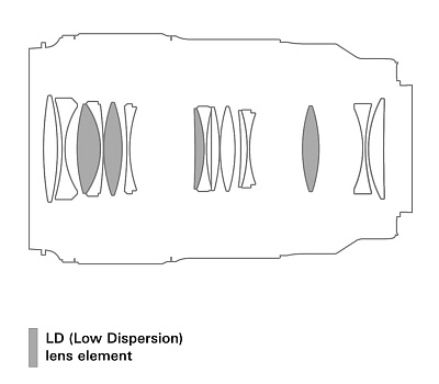 - Конструкция объектива: 15 элементов в 12 группах, из них 4 с низкой дисперсией (LD)