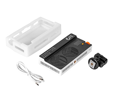 Встроенный литиевый аккумулятор большой емкости обеспечивает до 60 минут работы прибора на полной мощности. Для зарядки используется современный порт USB-C с поддержкой быстрой зарядки — можно использовать powerbank или сетевой адаптер (приобретаются отдельно). Компактные размеры и продуманная эргономика делают осветитель удобным для транспортировки и работы в любых условиях.