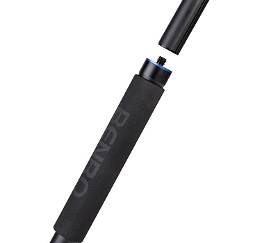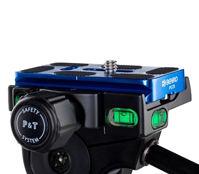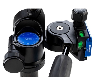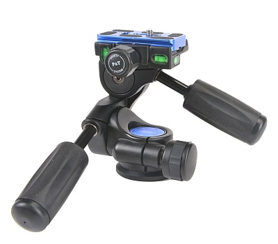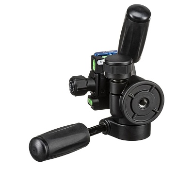 Две длинные ручки с резиновыми накладками отвечают за регулировку бокового наклона (-90 +15 градусов) и наклона вперед-назад (-35 + 90 градусов). На голове установлены пузырьковые уровни на трех осях. Короткая ручка отвечает за панорамирование на 360 градусов