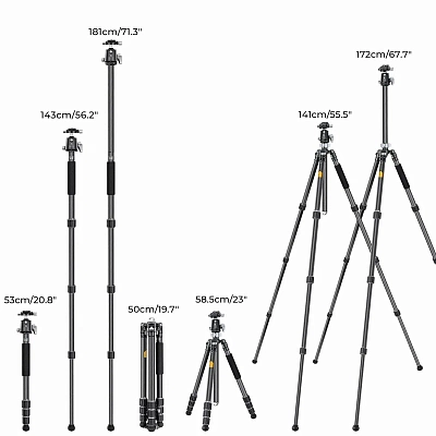 Трубки диаметром 28 мм изготовлены из углеродного волокна, легче и прочнее. Вес штатива с шаровой головкой составляет всего 1,76 кг, и его можно легко носить с собой.