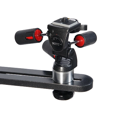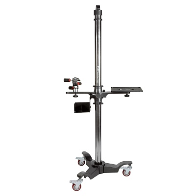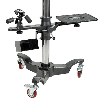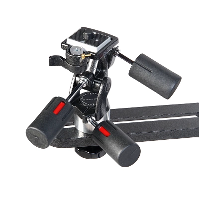 На горизонтальные штанги-консоли монтируются металлический столик (25,5 х 35,5 см) и поворотно-наклонная головка для установки камеры. Максимальный ход головки по штанге составляет 236 мм. К любой из горизонтальных штанг-консолей можно прикрепить лоток для аксессуаров.